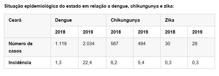 Dados do Ministério da Saúde apontam que o número de casos de dengue no estado do Ceará teve aumento de 81,8% em comparação com o mesmo período do ano passado. Até o dia 16 de março deste ano, o estado notificou 2.034 casos da doença. No mesmo período de 2018, foram 1.119 casos. A incidência no estado é de 22,4 casos/100 mil habitantes. Ceará não registrou óbitos em decorrência da doença neste ano.