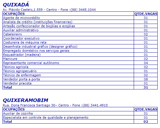 Confira abaixo somente as vagas para as cidades de Quixadá e Quixeramobim, divulgadas pelo Sine/IDT.