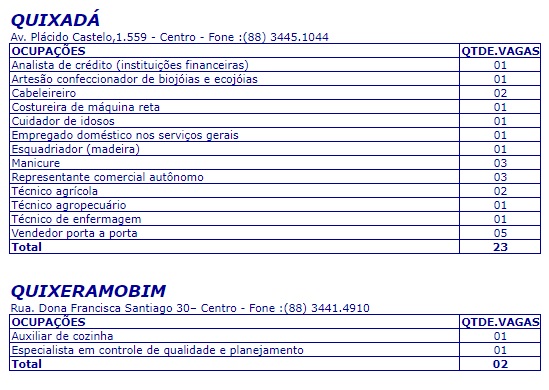 Confira abaixo somente as vagas para as cidades de Quixadá e Quixeramobim, divulgadas pelo Sine/IDT.