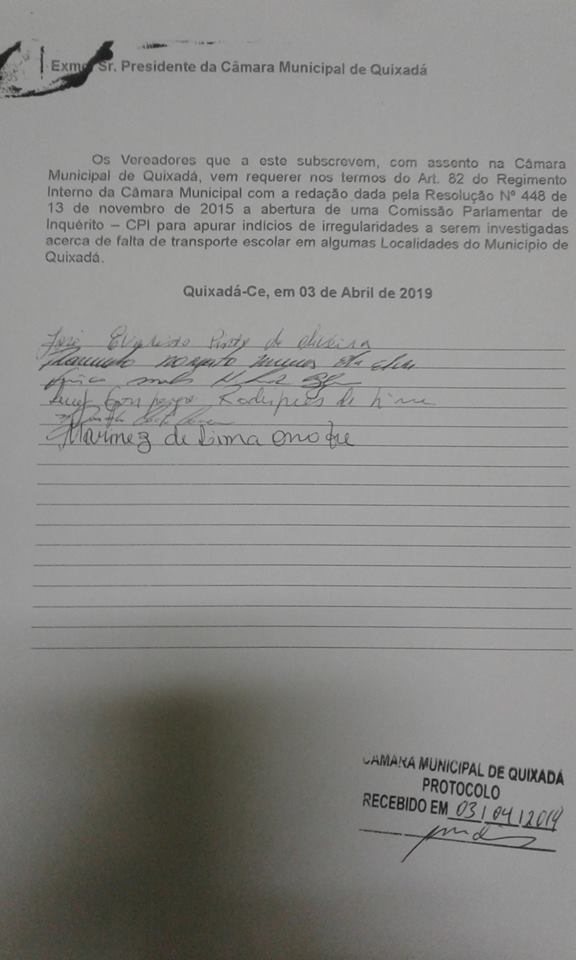 Assinaram ainda o pedido para instalação os vereadores Luiz do Hospital, Cabo Marlim, Evaristo Oliveira, Marcelo Ventura e Louro da Juatama.