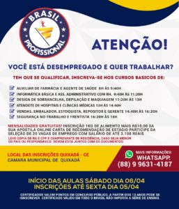 Para aquelas pessoas que desejam se qualificar e ingressar no mercado de trabalho que está cada dia mais concorrido, a empresa”Brasil Profissional” está trazendo a Quixadá uma oportunidade única e imperdível. São 6 cursos com mensalidades totalmente gratuitas. Existem vagas para os cursos de: Auxiliar de farmácia e agente de saúde, Informática básica e assistente administrativo com RH, Design de sobrancelha, depilação e maquiagem, Atendente de hospitais e clínica médica, Vendas, embalador, estoquista, repositor e gerente, Segurança do trabalho e frentista.