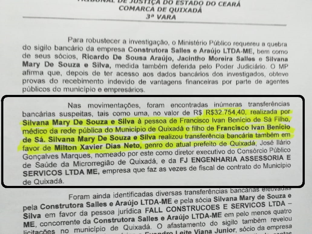 Em sua decisão o magistrado revelou: “Nas movimentações, foram encontradas inúmeras transferências bancárias suspeitas, tais como uma, no valor de R$ 32.754,40, realizada por Silvana Mary De Souza e Silva à pessoa de Francisco Ivan Benício de Sá Filho, médico da rede pública do Município de Quixadá e filho de Francisco Ivan Benício de Sá. Silvana Mary De Souza e Silva realizou transferência bancária também em favor de Milton Xavier Dias Neto, genro do atual prefeito de Quixadá, José Ilário Gonçalves Marques, nomeado por este como diretor executivo do Consórcio Público de Saúde da Microrregião de Quixadá”.