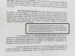Segundo o juiz, “pelo que restou demonstrado de forma indiciária, Milton Xavier Dias Neto participa ativamente do grupo criminoso, fazendo de tudo para encobrir seus rastros, destruindo até documentos que possam o incriminar, como se observa em um trecho da gravação telefônica interceptada”