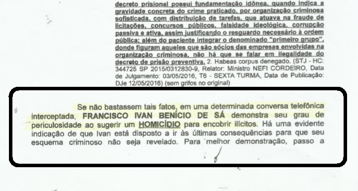 De acordo com o Juiz, se não bastassem os atos de corrupção, em uma determinada conversa telefônica interceptada, com autorização judicial, o presidente da câmara, Ivan Construções (PT), demonstra seu grau de periculosidade ao sugerir um homicídio. Ainda na peça, o magistrado afirma que há uma evidente indicação que Ivan está disposto a ir às últimas consequências para que seu esquema criminoso não seja revelado.