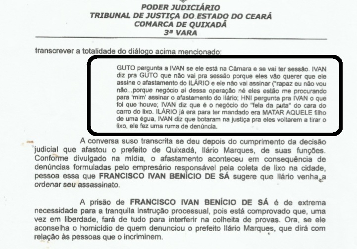 De acordo com os autos, a conversa aconteceu logo depois do cumprimento da decisão judicial que afastou Ilário Marques, em agosto de 2018, das funções de prefeito municipal de Quixadá. Na época, o afastamento do alcaide aconteceu na operação “Fiel da Balança” que apura denúncias de desvio de dinheiro na prefeitura e que, com isso, segundo o magistrado, Ivan teria sugerido que Ilário ordenasse o assassinato do empresário. Abaixo leia o conteúdo da conversa entre o vereador investigado e o interlocutor.