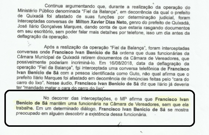 O fato foi descoberto pelo Ministério Público em uma das interceptações telefônicas autorizadas pela justiça dentro das investigações da operação “Casa de Palha”. O órgão afirma que Ivan Construções mantém uma funcionária na Câmara de Vereadores sem que ela trabalhe. Em um trecho das conversa captada pelo promotores, Ivan se mostra preocupado em alguém descobrir a existência dessa funcionária. Abaixo você confere o que diz o juiz em sua decisão.