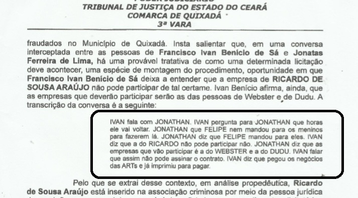 O Ministério Público sustenta que as conversas gravadas dos investigados revelam que as interpostas empresas funcionavam como laranjas do presidente da Câmara, que solicitava que os empresários o passasse detalhes sobre as obras, bem como ordenava a paralisação delas. A decisão judicial escancara o caráter e a índole de empresários e políticos que para a sociedade eram tidos como pessoas corretas, mas, que nos bastidores, prejudicaram com seus atos ilícitos a população de um município que, nos últimos anos, amarga o ostracismo econômico, prejudicando investimentos públicos nas áreas de Saúde, Saneamento, Educação, Infraestrutura, Esporte, Cultura, entre diversos serviços que poderiam ser ofertados aos quixadaenses.