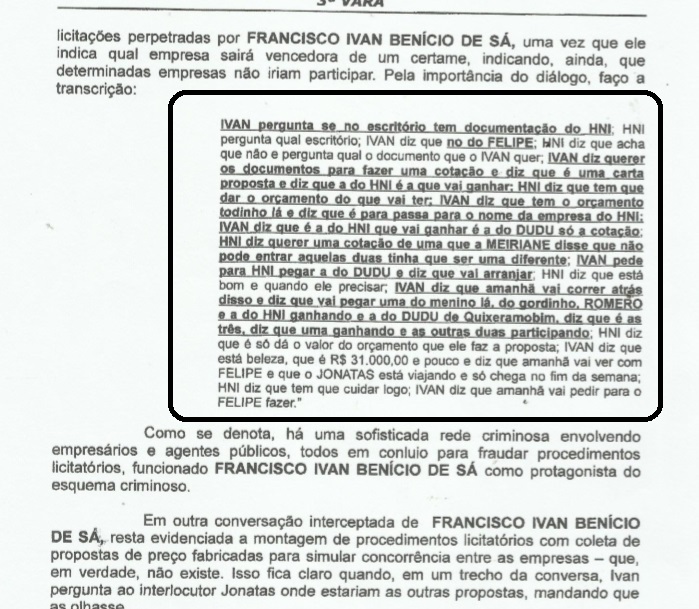 De acordo com o magistrado, em outra interceptação ficam mais evidentes as fraudes às licitações, nesta Ivan Construções indica qual empresa sairá vencedora do certame licitatório, indicando, ainda, que determinadas empresas não iriam participar. Na transcrição abaixo a empresa de “Dudu” é novamente citada como participante do esquema.