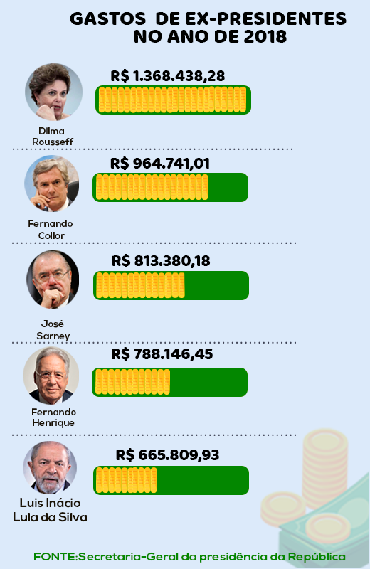 Esses privilégios custam caro à União, e, portanto, é a população que paga impostos. Em 2018, o Estado Brasileiro gastou R$ 4,6 milhões com cinco ex-presidentes – José Sarney, Fernando Collor, Fernando Henrique Cardoso, Luiz Inácio Lula da Silva e Dilma Rousseff – na época, Michel Temer ainda estava no cargo, que passou neste ano para Jair Bolsonaro.