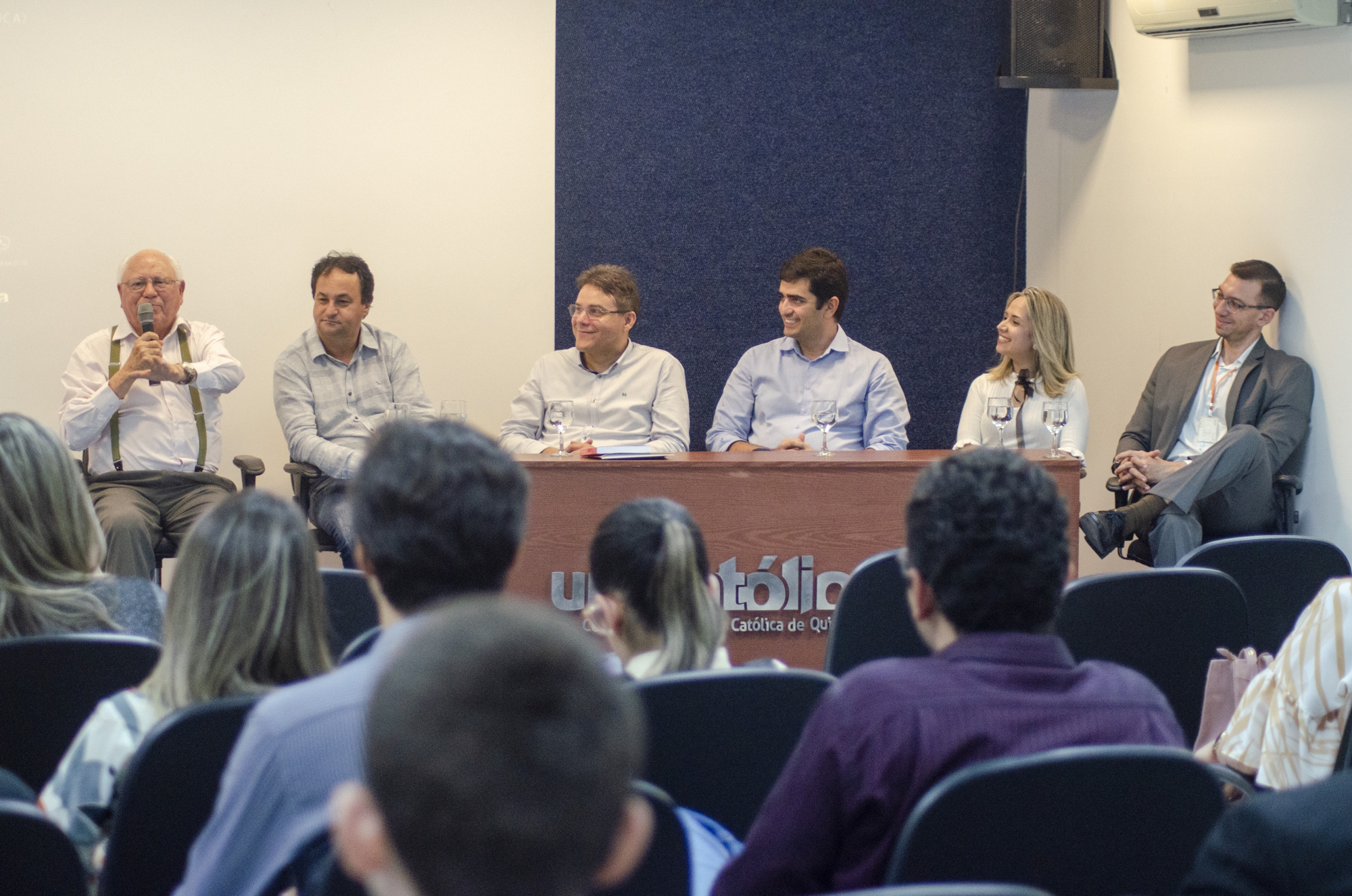 O momento contou com a presença do Reitor da UNICATÓLICA, professor Me. Marcos James Chaves Bessa; da Pró-Reitora de Pós-graduação e Pesquisa, professora Me. Karla Bruna Nogueira Torres Barros; do Pró-Reitor de Graduação e Extensão, professor Dr. Marcos Augusto Ferreira Nobre; do Procurador Institucional, professor LD. Manoel Messias de Sousa; do Superintendente Executivo, professor Cícero Félix; e do Coordenador Operacional do curso, professor Dr. Saulo Nunes de Carvalho Almeida. Ainda, como convidados para compor o debate, estiveram presentes no evento os professores Dr. Marcelo Lima Guerra, Juiz Titular da Vara do Trabalho de Quixadá, e Dr. João Paulo Allain, Coordenador Operacional do curso.
