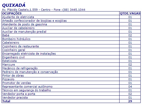 Confira abaixo somente as vagas para a cidades de Quixadá, divulgadas pelo Sine/IDT.