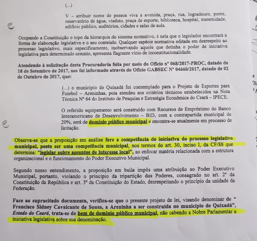 De acordo com Marcelo Ventura, o projeto de lei de Rachel recebeu o parecer contrário pela Procuradoria da Assembleia Legislativa, pois, segundo o órgão, esta era uma lei de âmbito municipal – documento acima. O prefeito tentou aprovar o projeto homenageando Sidney, na Câmara, mas os vereadores não aprovaram. Todos disseram não ao projeto do Executivo quixadaense. “Em conversa com os demais vereadores dessa casa, nenhum, por unanimidade, nenhum vereador aprovou o projeto do prefeito. O que aconteceu foi que o presidente da casa, Ivan Construções, não colocou o projeto em pauta dizendo que ia falar com o prefeito. Pois bem, nem colocou em pauta e nem falou com o prefeito porque nenhum vereador era a favor”, lembrou Marcelo Ventura, na sessão da última quinta-feira (6).
