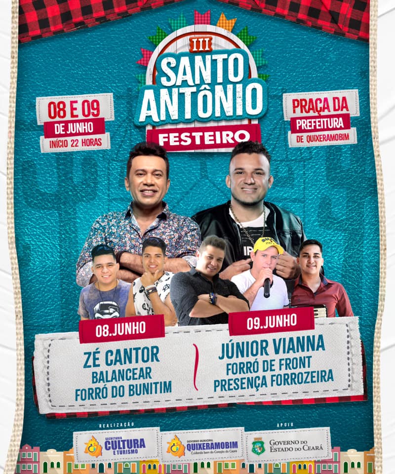 A cidade de Quixeramobim celebra desde o último dia 31 de maio os festejos do Padroeiro do município Santo Antônio. Uma vasta programação está sendo realizada todos os dias na praça da prefeitura e os festejos seguem até o próximo dia 13 de junho, dia em que se comemora o dia de Santo Antônio.