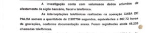 De acordo com o órgão ministerial, a investigação conta com volumosos dados oriundos de afastamento (quebra) de sigilo bancário, fiscal e telefônico. Somente na “Operação Casa de Palha”, as interceptações telefônicas somam a quantidade equivalente a 807,72 horas de gravações. Foram interceptadas 48.235 chamadas telefônicas.