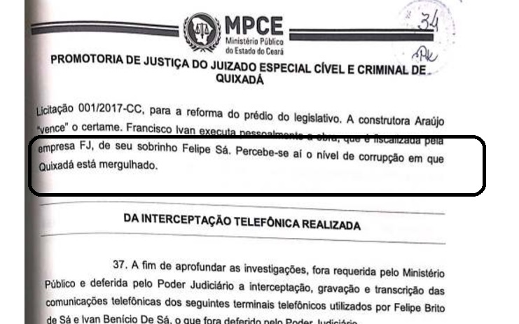 As interceptações deixaram os promotores estarrecidos com o que conseguiram, incluindo as provas documentais. de para o Ministério Público “Percebe-se ai o nível de corrupção em que Quixadá está mergulhado”, disse os promotores na peça entregue a Justiça Estadual.