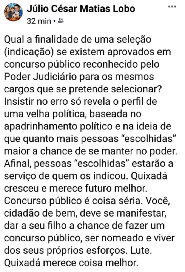 O defensor termina sua postagem incentivando os aprovados no concurso de 2016 e a sociedade para valorizar o ingresso no serviço público através de concurso. “Quixadá cresceu e merece futuro melhor. Concurso público é coisa séria. Você cidadão de bem, deve se manifestar, dar ao seu filho a chance de fazer um concurso público, ser nomeado e viver de seus próprios esforços. Lute. Quixadá merece coisa melhor”, finalizou Júlio César.
