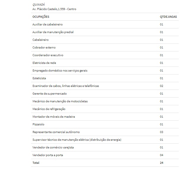 Para Quixadá as vagas disponíveis são para pizzaiolo, cobrador externo, cabeleireiro, dentre outros.