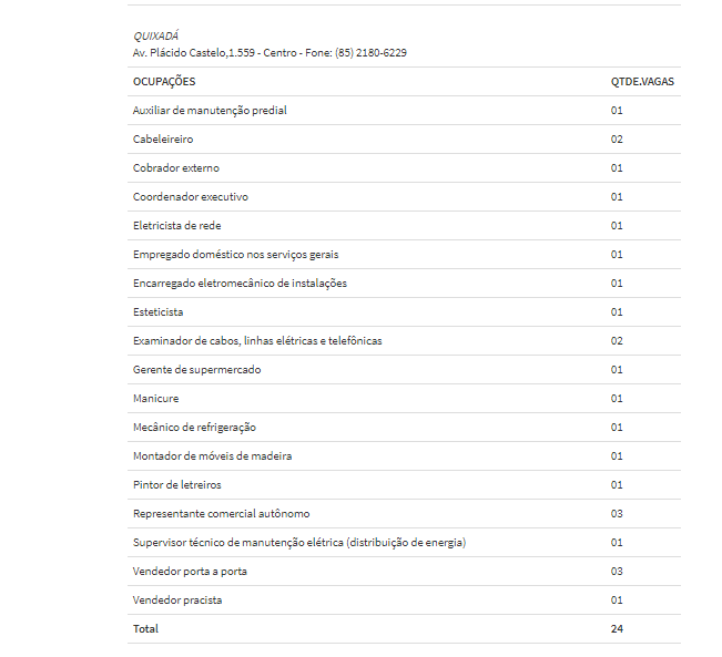 Confira abaixo somente as vagas para a cidade de Quixadá, divulgadas pelo Sine/IDT.