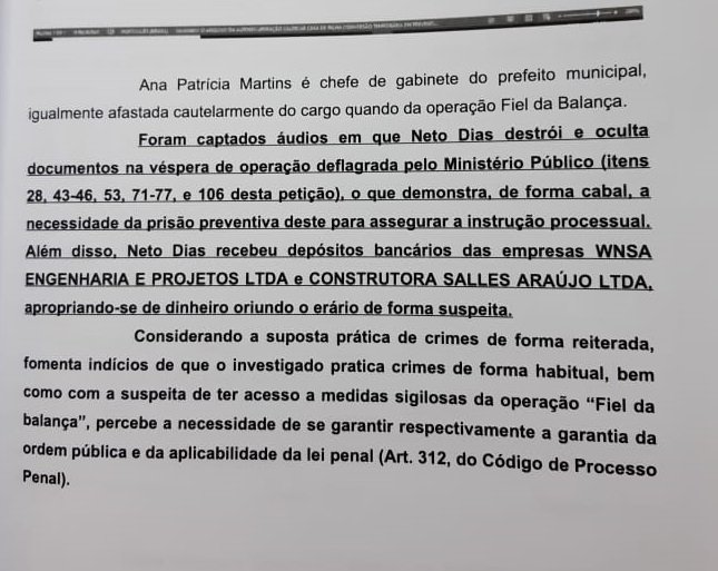 Além de receber valores em sua conta bancária de suposta propina de empresa que presta serviço a prefeitura, o genro do prefeito foi flagrado, numa interceptação telefônica, destruindo provas um dia antes da deflagração da operação “Fiel da Balança” que aconteceu em agosto de 2018. Segundo o juiz, “pelo que restou demonstrado de forma indiciária, Milton Xavier Dias Neto participa ativamente do grupo criminoso, fazendo de tudo para encobrir seus rastros, destruindo até documentos que possam o incriminar, como se observa em um trecho da gravação telefônica interceptada”.