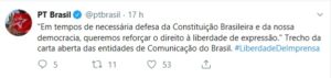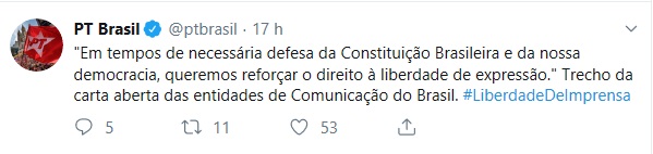 O Partido dos Trabalhadores (PT) não se entende em vários assuntos que envolve o interesse da sociedade. A liberdade de imprensa é um desses tema. Ontem, o PT Brasil publicou um tweet que valoriza a liberdade de expressão, que inclui os meios de comunicação. A legenda citou um trecho da carta aberta das entidades de Comunuicação do Brasil, em apoio ao jornalista americano Gleen Greenwald, do The Intercept, que publicou diálogos por meio de interceptações telefônicas atribuídas à autoridades do Poder Executivo federal. “Em tempos de necessária defesa da Constituição Brasileira e da nossa democracia, queremos reforçar o direito à liberdade de expressão”, trecho do documento citado pelo partido.