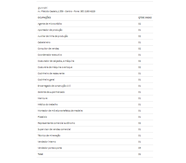 Para Quixadá as vagas disponíveis são para cozinheiro geral, vendedor interno, agente de microcrédito, coordenador executivo , dentre outras.
