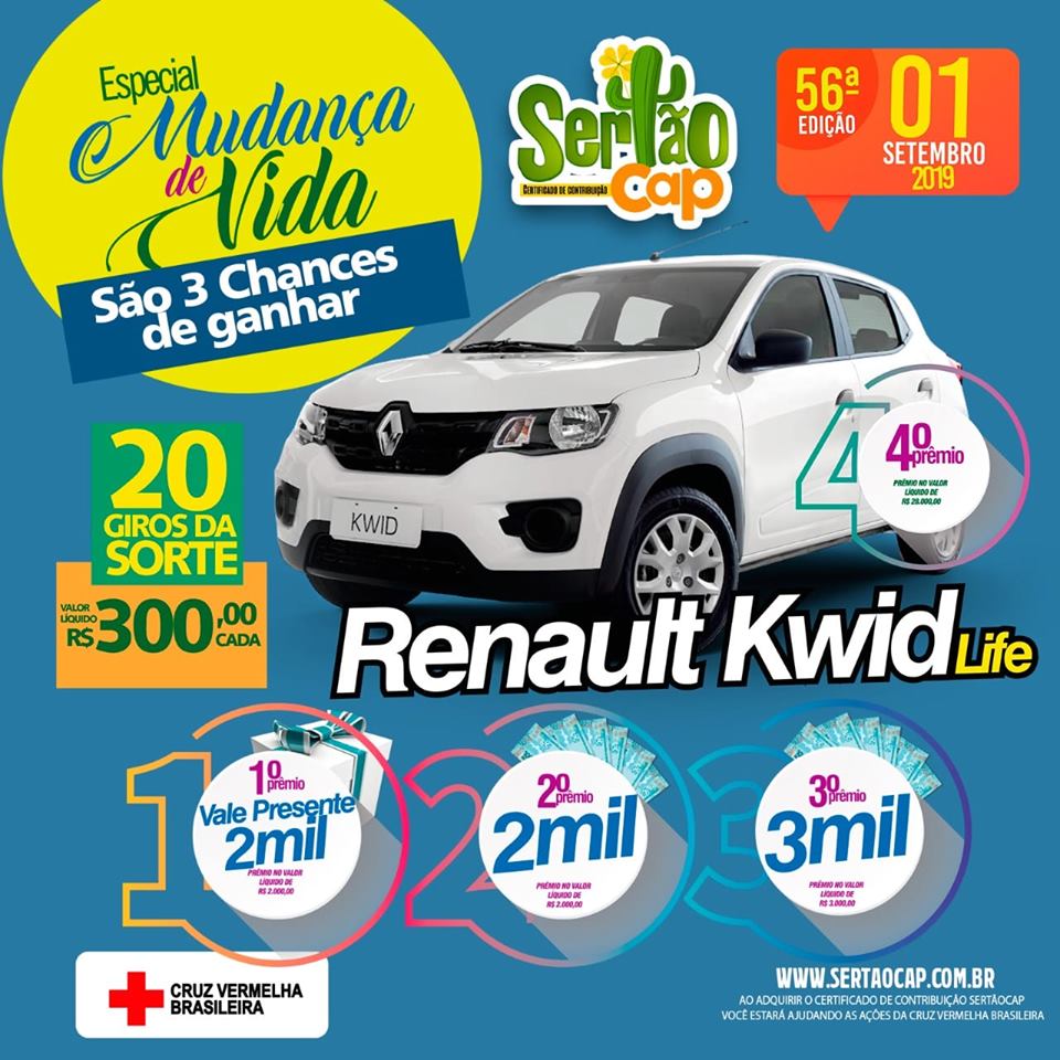 Neste domingo (01) na Edição Especial Mudança de Vida, o Sertão Cap traz uma super premiação. Só no 4º Prêmio tem um Renault Kwid 0Km, e mais R$ 7 mil do 1º ao 3º Prêmios, 20 Giros da Sorte de R$ 300,00 cada e mais R$ 74 mil na Premiação Instantânea.