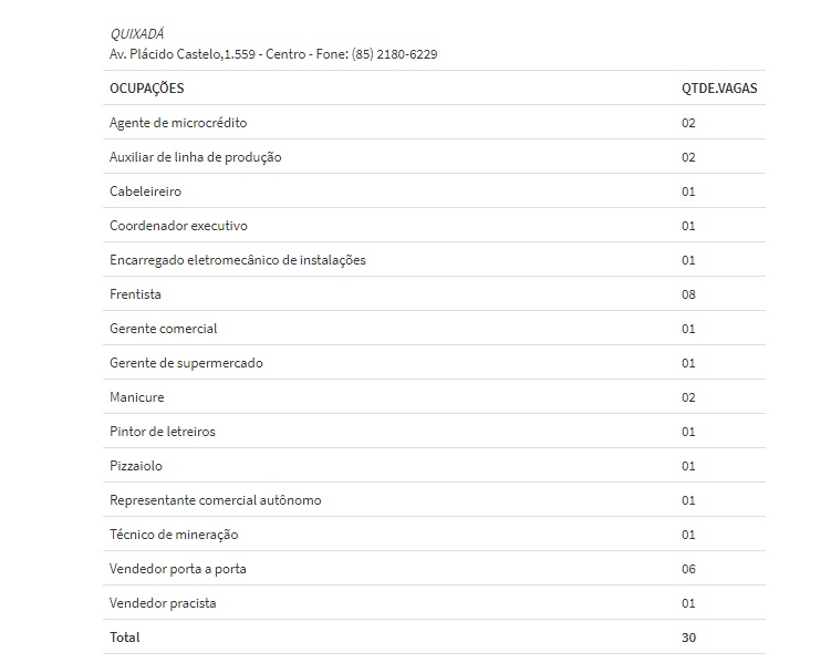 Para Quixadá as vagas disponíveis são para frentista, manicure, pintor de letreiros, vendedor porta a porta, dentre outras.