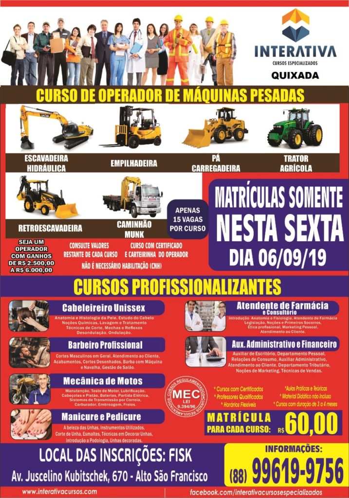 Está sendo ofertado ainda um curso de Operador de Máquinas Pesadas com um preço imperdível. Todos os cursos são certificados, contam com professores qualificados, aulas práticas e teóricas e tem duração de 3 a 4 meses.