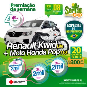 Neste domingo (08) na Edição Especial da Independência, o Sertão Cap traz uma super premiação. Só no 4º Prêmio tem um Renault Kwid e uma Honda Pop 0Km, e mais R$ 6 mil do 1º ao 3º Prêmios, além de 20 Giros da Sorte de R$ 300,00 cada e mais R$ 74 mil na Premiação Instantânea.