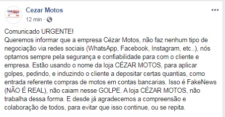 Na tarde desta sexta-feira (06) a loja Cezar Motos que fica localizada na avenida Plácido Castelo, no centro da cidade, emitiu um comunicado desmentindo que a empresa não faz nenhum tipo de negociação via redes sociais (WhatsApp, Facebook, Instagram).