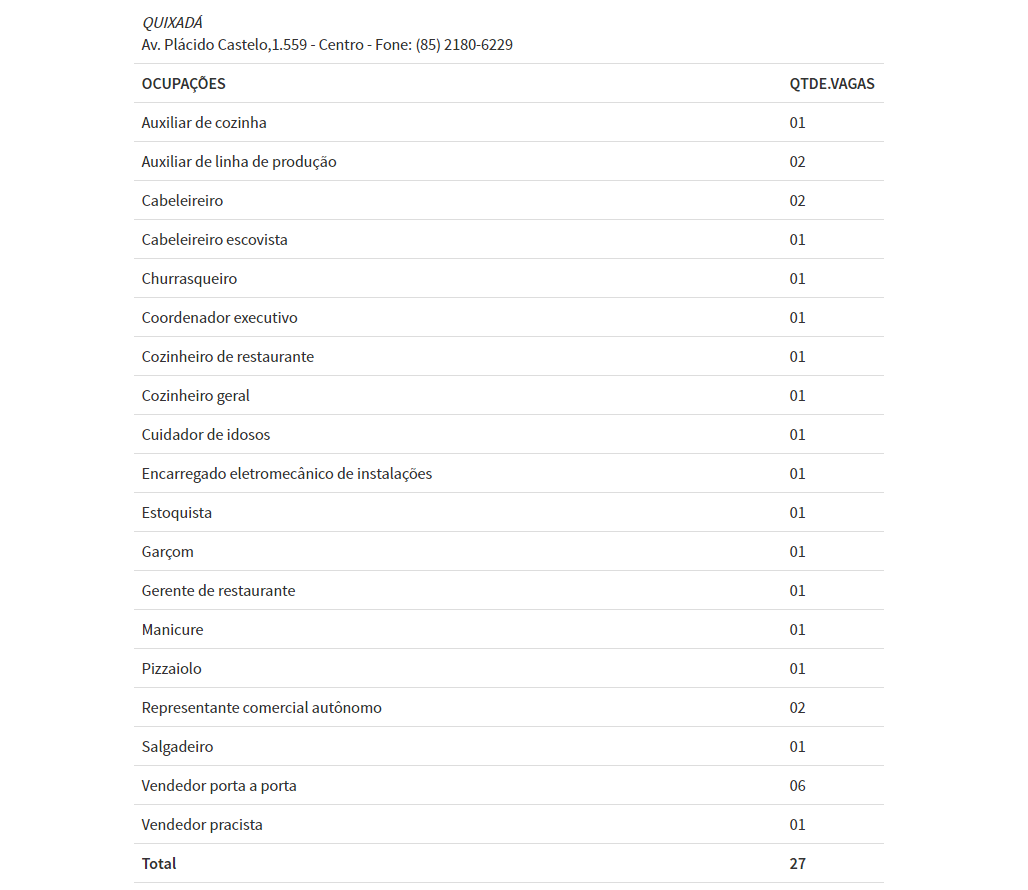 Importante ressaltar que não serão repassadas por telefone, as pessoas devem se deslocar até um dos escritórios do Sine. Para conferir a lista completa das oportunidades de emprego para esta segunda-feira (30) CLIQUE AQUI. Confira abaixo somente as vagas para a cidade de Quixadá, divulgadas pelo Sine/IDT.