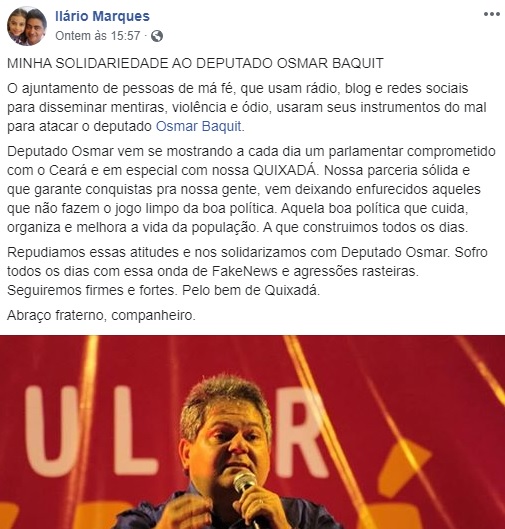 Nessa segunda-feira (14), o prefeito teve mais uma atitude de afrontar o órgão ministerial. Ele usou seu perfil no Facebook para sair em defesa do deputado Osmar Baquit, que de acordo com o MPCE, usou o gabinete, na Assembleia Legislativa, para fornecer documento falso para garantir diárias ao presidente da Câmara Municipal de Quixadá, Ivan Construções, que está preso. Ilário ao criticar as matérias sobre o envolvimento do deputado em conseguir “falsas diárias” para o chefe do Legislativo quixadaense, disse que o Ministério Público é responsável pelos veículos de comunicação produzirem notícias falsas. “Repudiamos essas atitudes e nos solidarizamos com Deputado Osmar. Sofro todos os dias com essa onda de FakeNews e agressões rasteiras. Seguiremos firmes e fortes. Pelo bem de Quixadá”, disse o alcaide.
