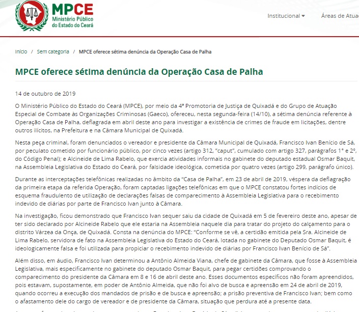 Abaixo você confere a publicação no site oficial do Ministério Público do Estado do Ceará que o prefeito de Quixadá disse tratar-se de uma “fake news”.