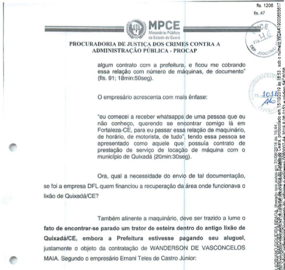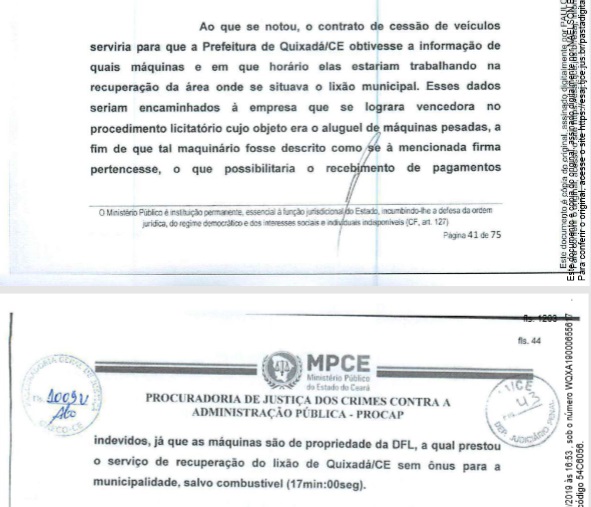 Na peça, o membro do MPCE indaga: “Ora, qual a necessidade do envio de tal documentação, se foi a empresa DFL quem financiou a recuperação da área onde funcionava o lixão de Quixadá-CE?”