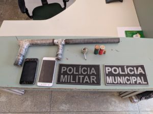 Segundo informações da Polícia Municipal de Pedra Branca, por volta de 10h30min desta segunda-feira (28), agentes da Guarda Civil Municipal receberam a informação que um foragido da cadeia de Quixeramobim estaria escondido na localidade de Sítio Mocó, zona rural de Pedra Branca. Com apoio da Polícia Militar, os agentes se deslocaram até o local indicado na denúncia e quando lá chegaram os policiais cercaram a residência e conseguiram prender o acusado identificado como Marcio Roniele da Silva, 35 anos. O mesmo ainda tentou fugir mas acabou contido pelos policiais. Com o acusado foi encontrada uma arma cal.12 de fabricação artesanal, além de 02 cartuchos do mesmo calibre e 01 cartucho de cal.38 deflagrado.
