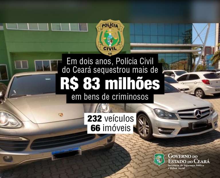Conforme relatório produzido pelo DRA, nos últimos dois anos, a Polícia Civil cearense sequestrou mais de R$ 83 milhões em bens de criminosos. Entre os bens estão 232 veículos – entre eles automóveis, motocicletas e uma aeronave –, 66 imóveis – como casas, apartamentos, pontos comerciais e terrenos –, além de valores guardados em contas bancárias, joias e pagamentos de previdência privada. Ainda conforme o DRA, os valores são oriundos de ações policiais realizadas pelas delegacias de Repressão às Ações Criminosas Organizadas (Draco), dos Crimes Contra Finanças Públicas (DCCAFP) – que deu lugar a Delegacia de Combate à Corrupção (Decor) –, além das Delegacias Regional do Crato e Municipal de Quixeramobim.