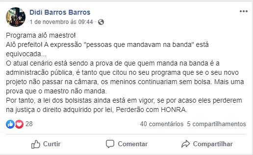 O Maestro Didi Barros utilizou seu perfil nas redes sociais para se defender dos ataques do petista e demonstrar novamente total apoio aos integrantes da banda. “Alô prefeito! A expressão “pessoas que mandavam na banda” está equivocada… O atual cenário está sendo a prova de que quem manda na banda é a administração pública, é tanto que citou no seu programa que se o seu novo projeto não passar na câmara, os meninos continuariam sem bolsa. Mais uma prova que o maestro não manda. Por tanto, a lei dos bolsistas ainda está em vigor, se por acaso eles perderem na justiça o direito adquirido por lei, Perderão com HONRA.”