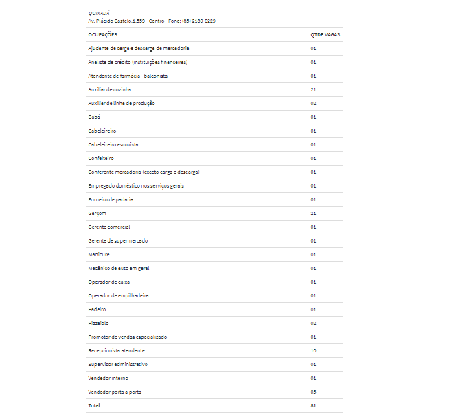 Importante ressaltar que não serão repassadas por telefone, as pessoas devem se deslocar até um dos escritórios do Sine. Para conferir a lista completa das oportunidades de emprego para esta segunda-feira (18) CLIQUE AQUI. Confira abaixo somente as vagas para a cidade de Quixadá, divulgadas pelo Sine/IDT.