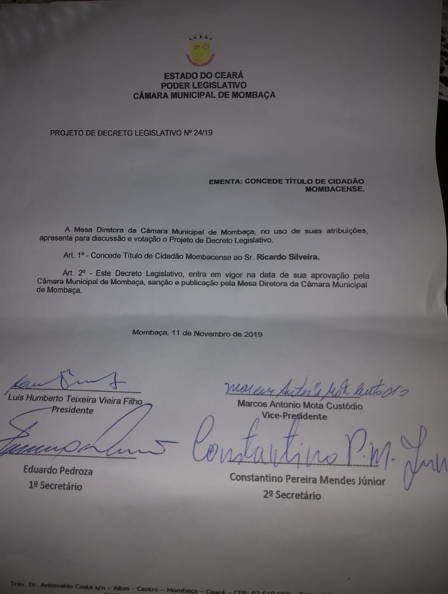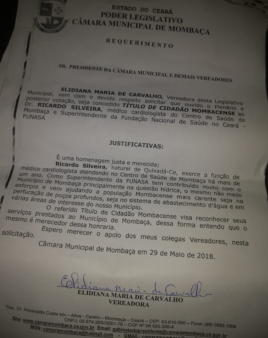 A vereadora Elidiana de Carvalho, que propôs o decreto aprovado no dia 11 de novembro pelos demais parlamentares da Câmara Municipal de Mombaça, destacou, também, o importante trabalho de Ricardo Silveira à frente da Funasa, de agosto de 2017 a 14 de outubro de 2019. “Tem contribuído muito com o município de Mombaça principalmente na questão hídrica, o mesmo não mede esforços e vem ajudando a população mombacense mais carente seja na perfuração de poços profundos, seja no sistema de abastecimento d’água e em várias áreas de interesse do nosso Município”, enalteceu a vereadora.