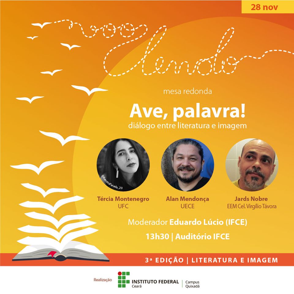 À tarde, com início às 13h30, terá a mesa redonda Ave, palavra!: diálogo entre literatura e imagem, com Tércia Montenegro (professora da Universidade Federal do Ceará, Alan Mendonça (músico), Jards Nobre (professor do Colégio Virgílio Távora), moderadora pelo professor Eduardo Lúcio. A programação segue até à noite.