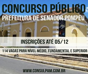 A Prefeitura Municipal de Banabuiú após realizar provas do concurso público em novembro, no próximo dia 15 de dezembro promoverá o certame para cirurgião dentista e advogado. Já a Prefeitura de Senador Pompeu, encerrou as inscrições para cargos de nível fundamental, médio e superior para 68 vagas imediatas e mais 46 para cadastro de reserva e realizará as provas nos próximos dias 21 e 22 de dezembro.