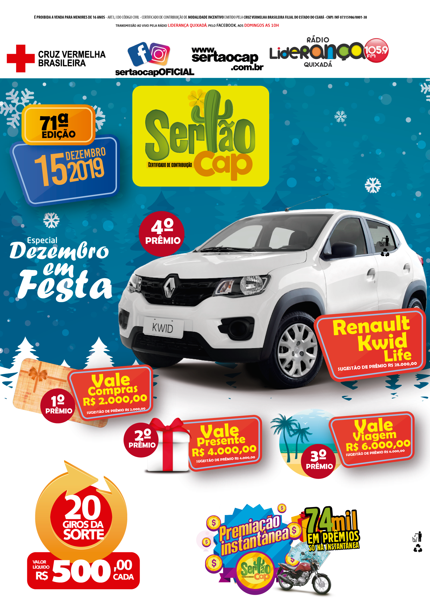 Neste domingo (15) o Sertão Cap chega a sua 71ª edição e está com uma premiação especial. No 1º prêmio tem um vale compras de R$ 2 mil, no 2º prêmio tem um vale presente de R$ 4 mil, já no 3º prêmio é um vale viagem no valor de R$ 6 mil e somente no 4º prêmio, 01 Renault Kwid 0KM, além de 20 giros da sorte no valor de R$ 500,00 cada. Além de toda essa premiação o certificado ainda vem com R$ 74.000,00 na premiação instantânea.