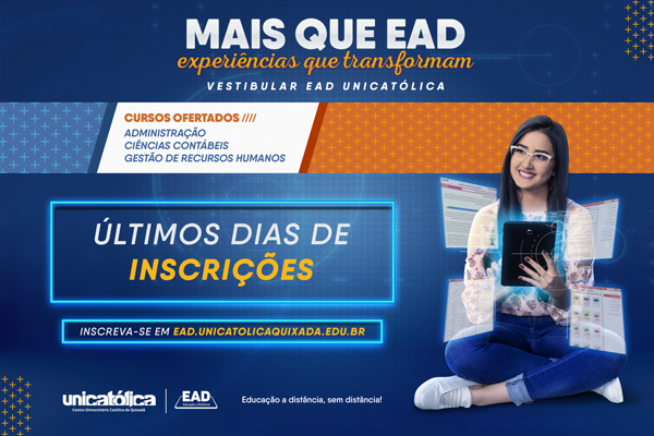 O Vestibular EaD 2020 da UNICATÓLICA está com os últimos dias de inscrições. Ao todo, são 1.300 vagas destinadas aos cursos ofertados na modalidade a distância (EaD), a saber: Administração e Ciências Contábeis, com carga horária de 3000 horas cada e duração de 4 anos, e Gestão de Recursos Humanos, com carga horária de 1680 horas e duração de 2 anos.
