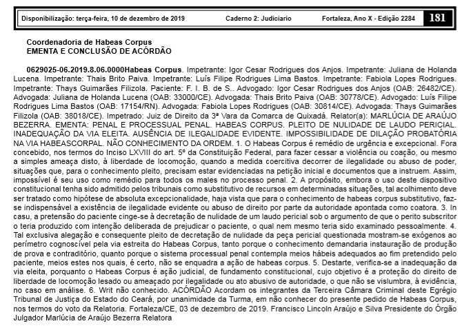 Todavia, a desembargadora relatora do habeas corpus, Marlúcia de Araújo Bezerra, ao apreciar o pedido, decidiu que: “Destarte, verifica-se a inadequação da via eleita, porquanto o Habeas Corpus é ação judicial, de fundamento constitucional, cujo objetivo é a proteção do direito de liberdade de locomoção lesado ou ameaçado por ilegalidade ou ato abusivo de autoridade, o que não se vislumbra, à evidência, no caso em análise. Writ não conhecido. ACÓRDÃO Acordam os integrantes da Terceira Câmara Criminal deste Egrégio Tribunal de Justiça do Estado do Ceará, por unanimidade da Turma, em não conhecer do presente pedido de Habeas Corpus”.