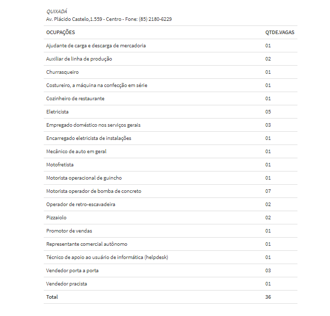 Importante ressaltar que não serão repassadas por telefone, as pessoas devem se deslocar até um dos escritórios do Sine. Para conferir a lista completa das oportunidades de emprego para esta segunda-feira (16) CLIQUE AQUI. Confira abaixo somente as vagas para a cidade de Quixadá, divulgadas pelo Sine/IDT.