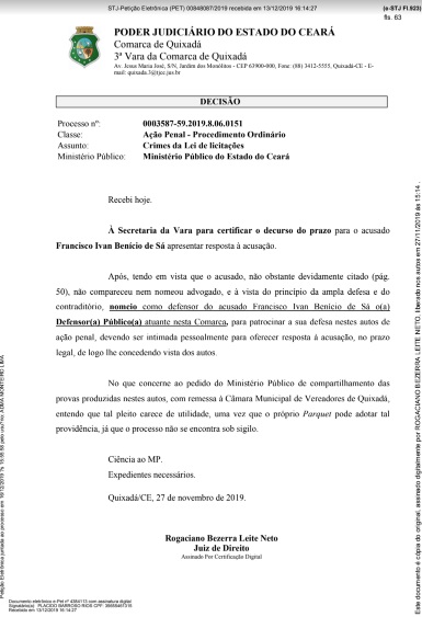 “… e à vista do princípio da ampla defesa e do contraditório, nomeio como defensor do acusado Francisco Ivan Benício de Sá o(a) Defensor(a) Público(a) atuante nesta Comarca, para patrocinar a sua defesa nestes autos de ação penal, devendo ser intimada pessoalmente para oferecer resposta à acusação, no prazo legal, de logo lhe concedendo vista dos autos”, disse o magistrado na decisão.