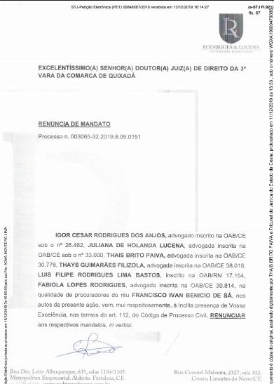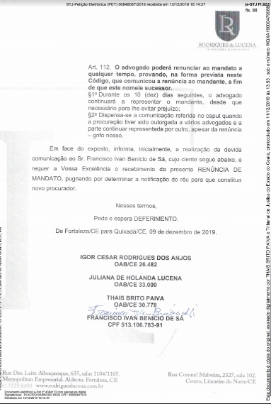 De acordo com documentos que o Monólitos Post obteve com exclusividade, os advogados que representavam o chefe do Legislativo renunciaram a defesa de Ivan Construções no último dia 09 de dezembro. Com isso, o Juiz respondendo pela 3ª Vara da Comarca de Quixadá, Rogaciano Bezerra Leite Neto, determinou que um dos defensores públicos do estado amparasse judicialmente o petista.