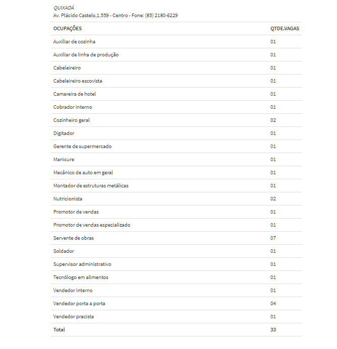 Importante ressaltar que não serão repassadas por telefone, as pessoas devem se deslocar até um dos escritórios do Sine. Para conferir a lista completa das oportunidades de emprego para esta segunda-feira (13) CLIQUE AQUI. Confira abaixo somente as vagas para a cidade de Quixadá, divulgadas pelo Sine/IDT.