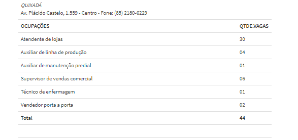 Importante ressaltar que não serão repassadas por telefone, as pessoas devem se deslocar até um dos escritórios do Sine. Para conferir a lista completa das oportunidades de emprego para esta segunda-feira (27) CLIQUE AQUI. Confira abaixo somente as vagas para a cidade de Quixadá, divulgadas pelo Sine/IDT.