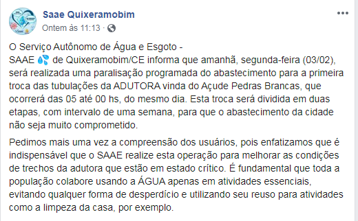 Nesta segunda-feira (03) o Serviço Autônomo de Água e Esgoto – SAAE de Quixeramobim iniciou a troca nas tubulações da adutora. Para que o serviço seja efetuado, houve a paralisão programada no serviço de abastecimento do município durante toda esta segunda-feira. Os trabalhos tiveram início por volta de 5h da manhã e devem se estender até as 00h.